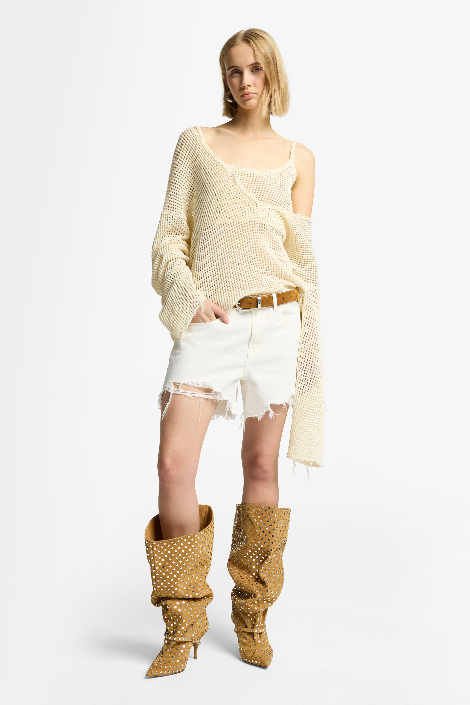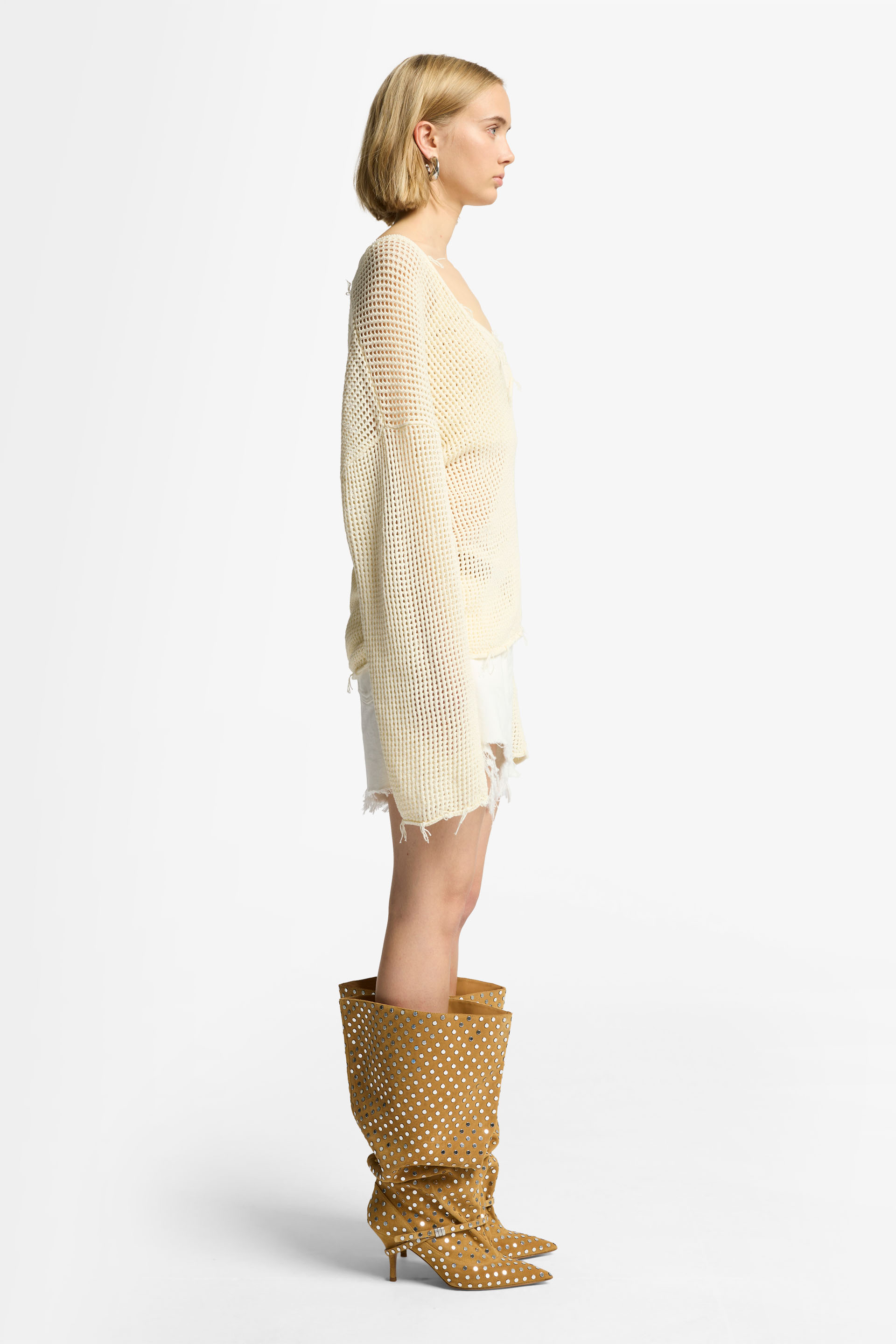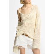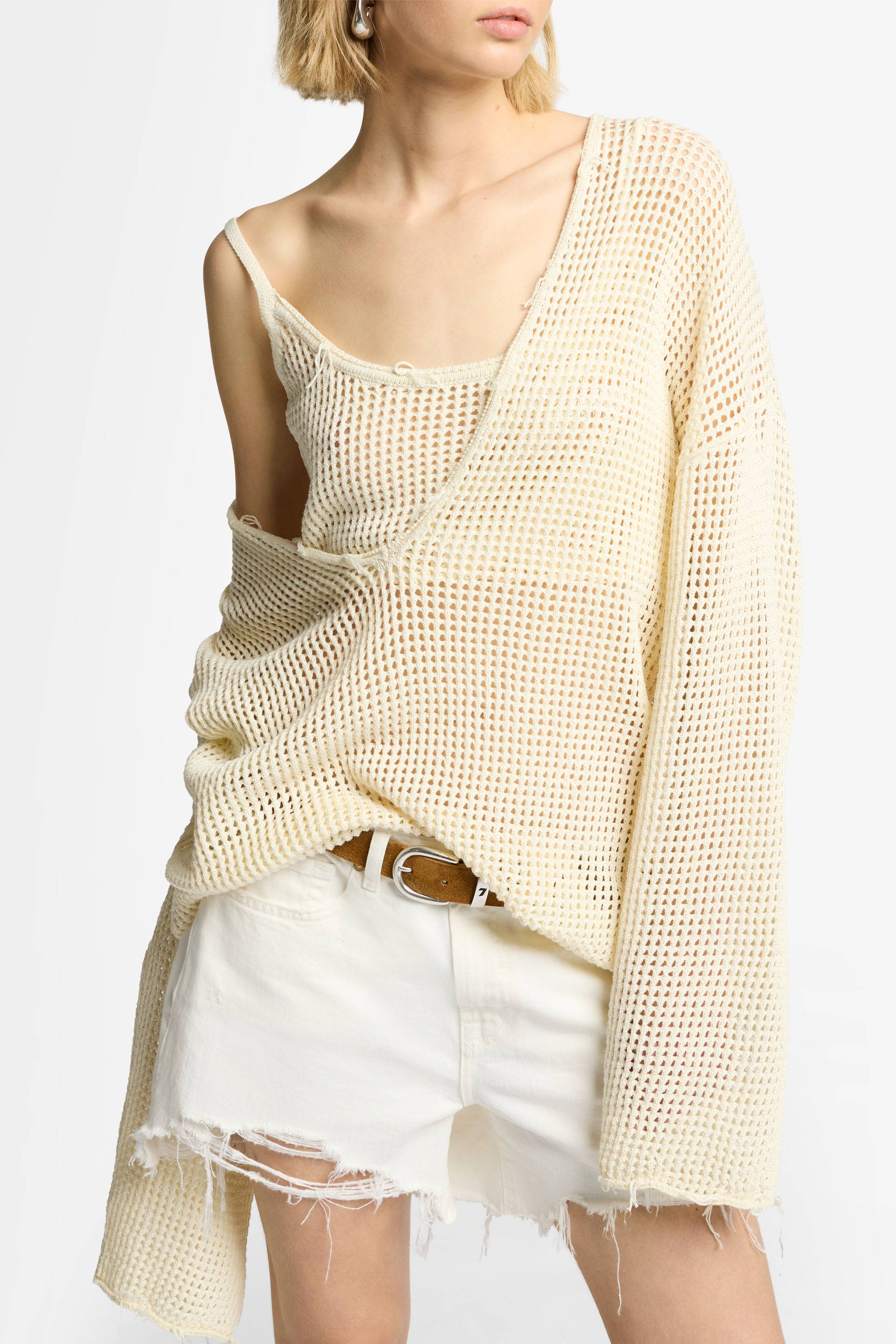 Esta temporada, añade nuestro jersey con escote de pico pronunciado a tu colección de prendas de punto. Su diseño de corte amplio está confeccionado en una suave mezcla de algodón de color crudo que va con todo. Nos encanta lucirlo con nuestra camiseta de tirantes de corte cropped y vaqueros cortos de tiro alto.