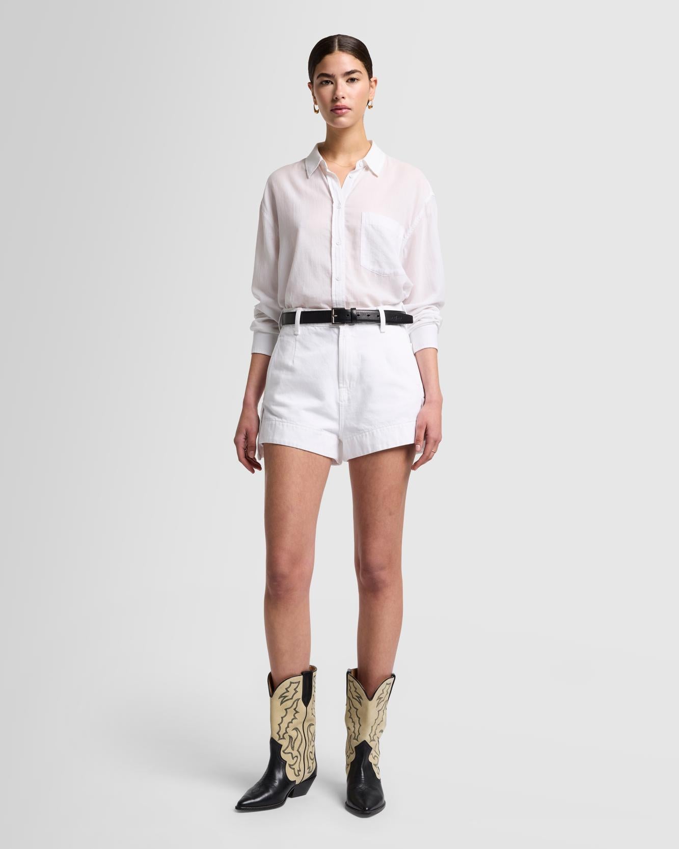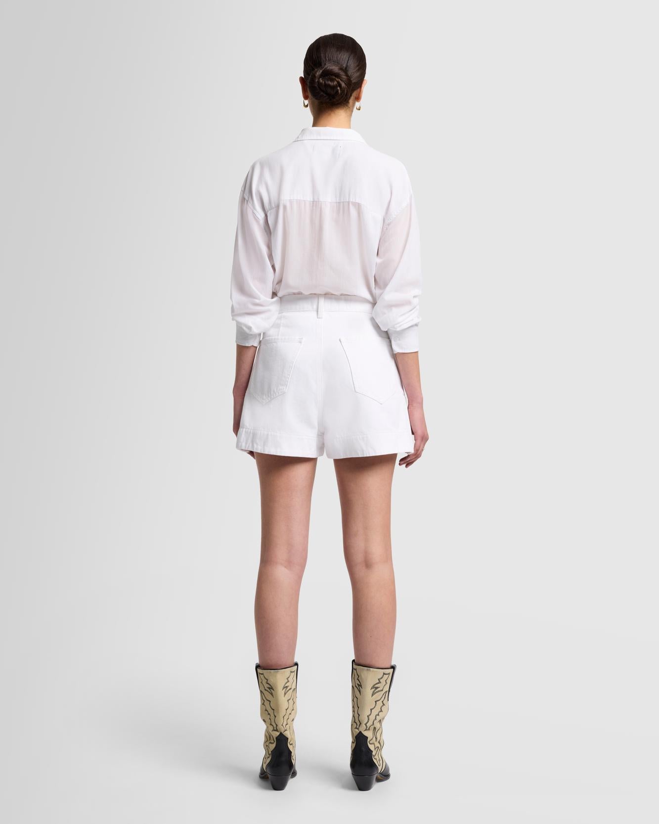 Estos shorts blancos brillantes presentan una silueta de cintura alta y favorecedores pliegues en la parte delantera. El bajo escalonado alarga la espalda. Ponte estos shorts de corte alto que quedan elegantes tanto con el blanco puro como con los colores atrevidos de la temporada.