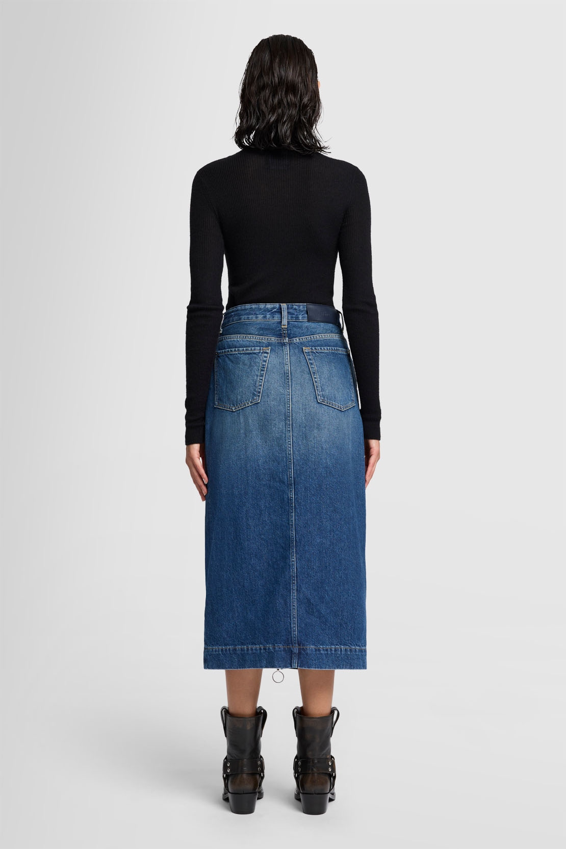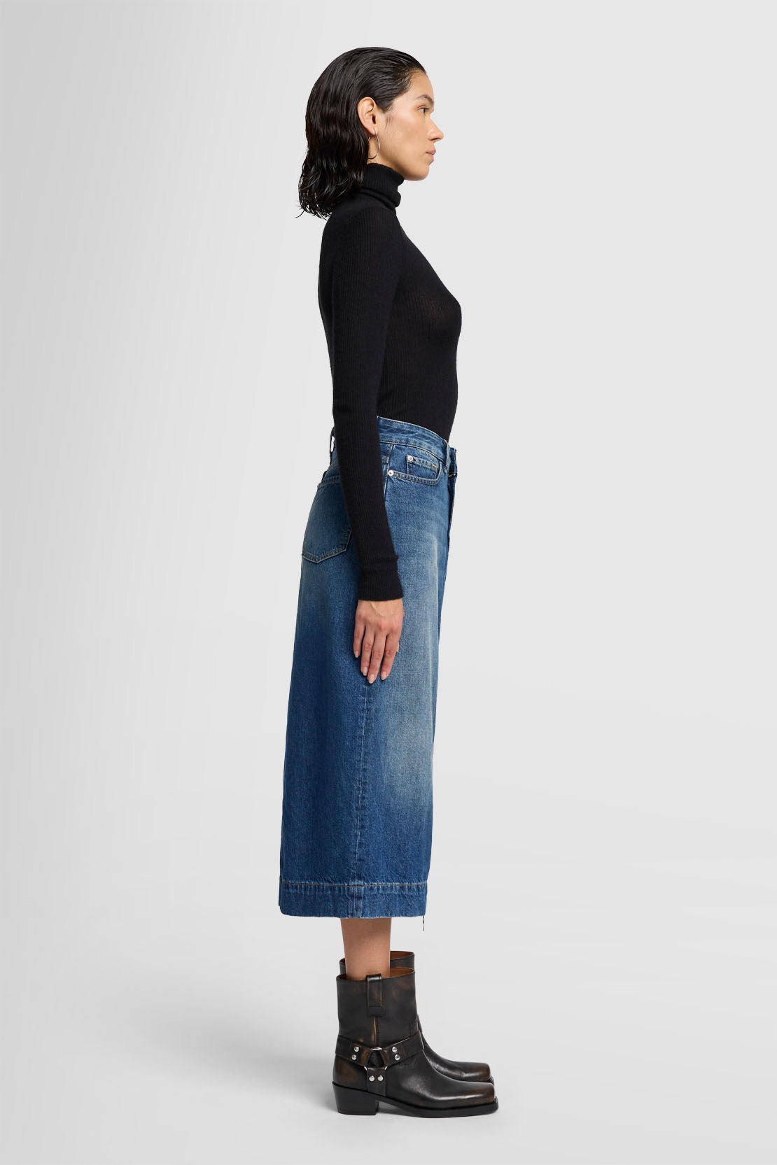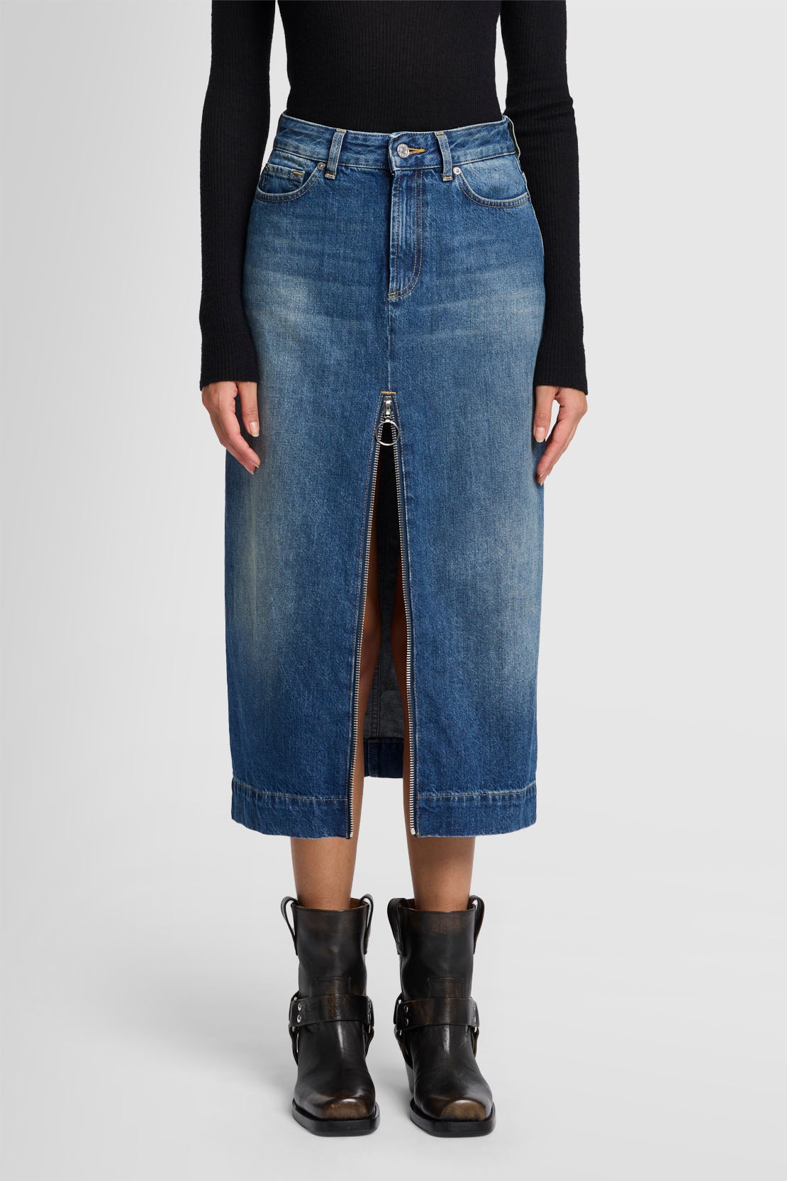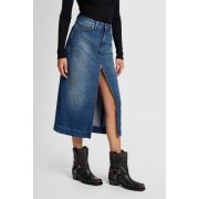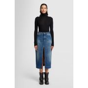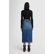 La falda Amber, un modelo que llevarás durante años, está confeccionada en tejido denim azul oscuro con un efecto desteñido de inspiración vintage. Presenta un largo midi, una abertura delantera y detalles auténticos.