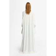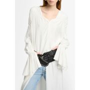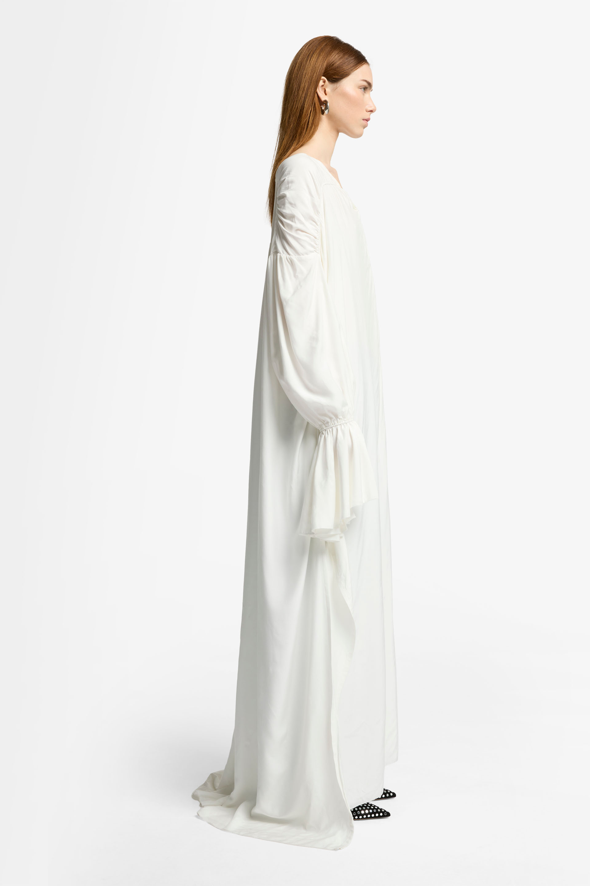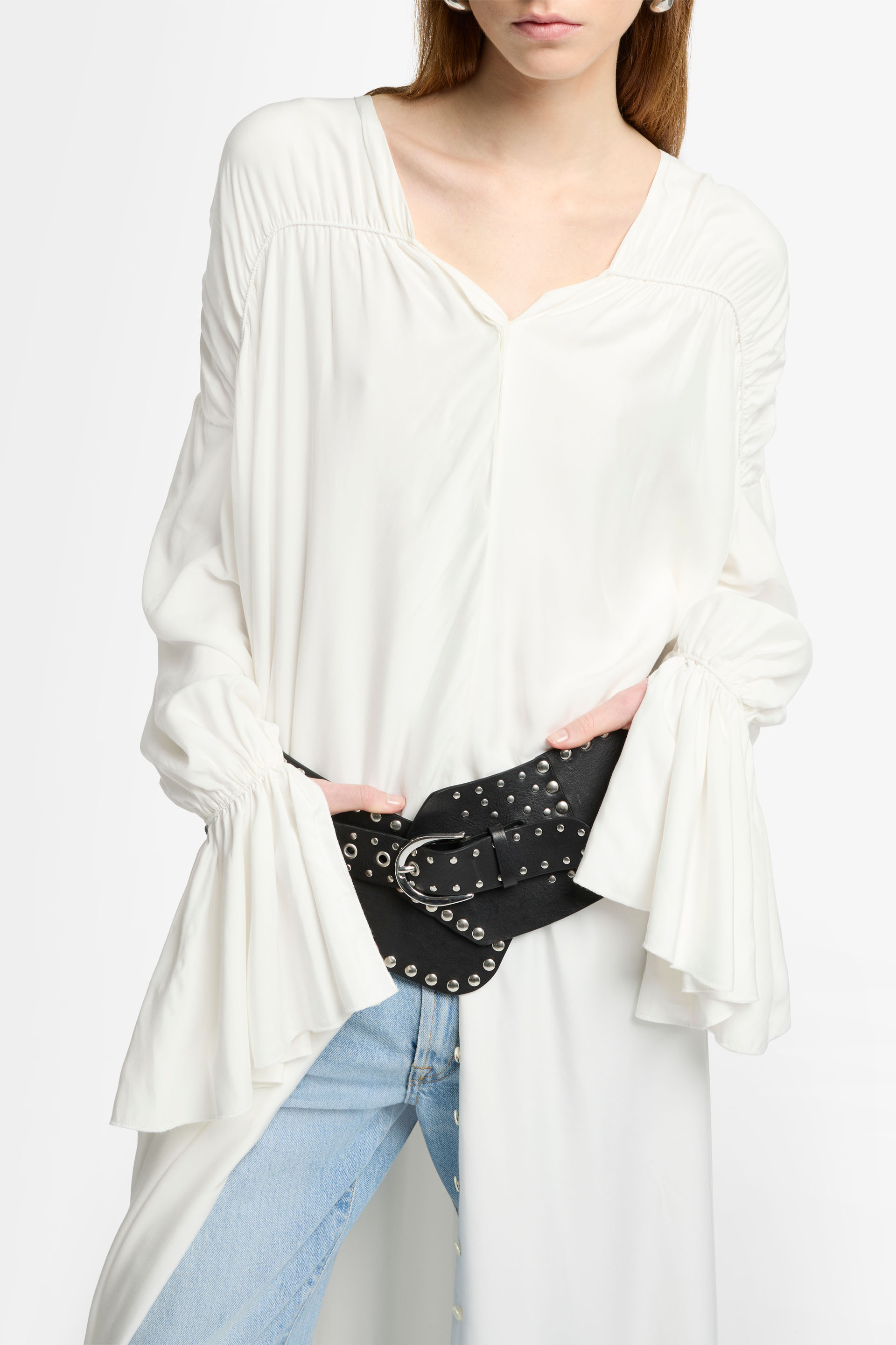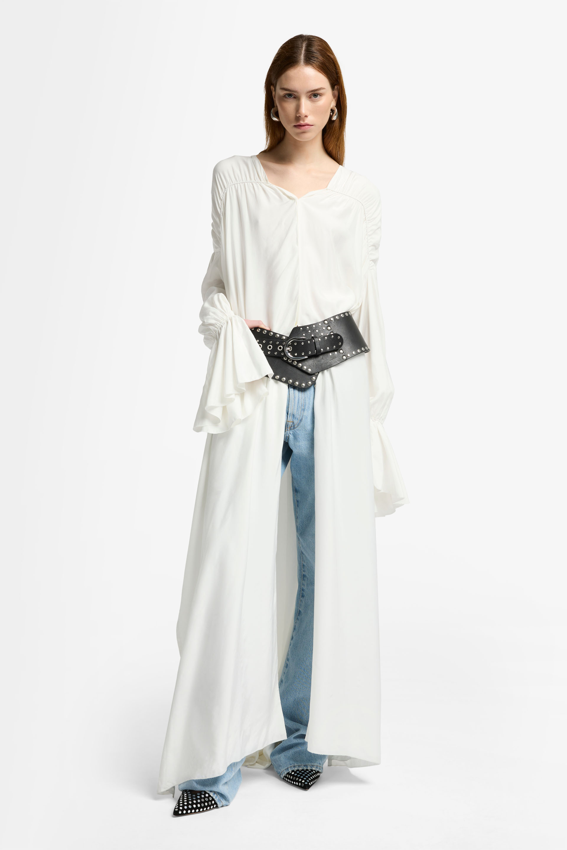Luce un espíritu bohemio con nuestro vestido Ariel de temporada. Esta prenda larga, elaborada en un vaporoso tejido de mezcla de seda, incluye dramáticas mangas con puños campanados, así como detalles fruncidos en los hombros y la parte trasera para crear una preciosa silueta. Destaca por un versátil cierre de botones en la parte delantera: puede llevarse como vestido o parcialmente abierto con vaqueros y un cinturón llamativo.