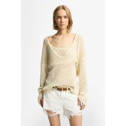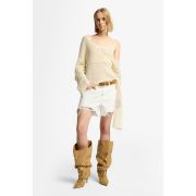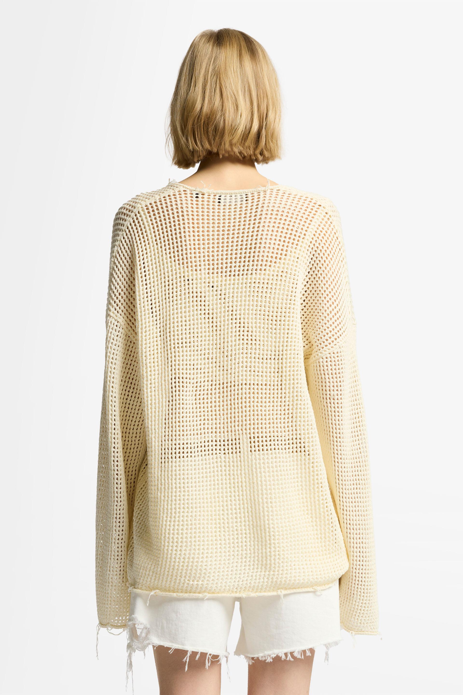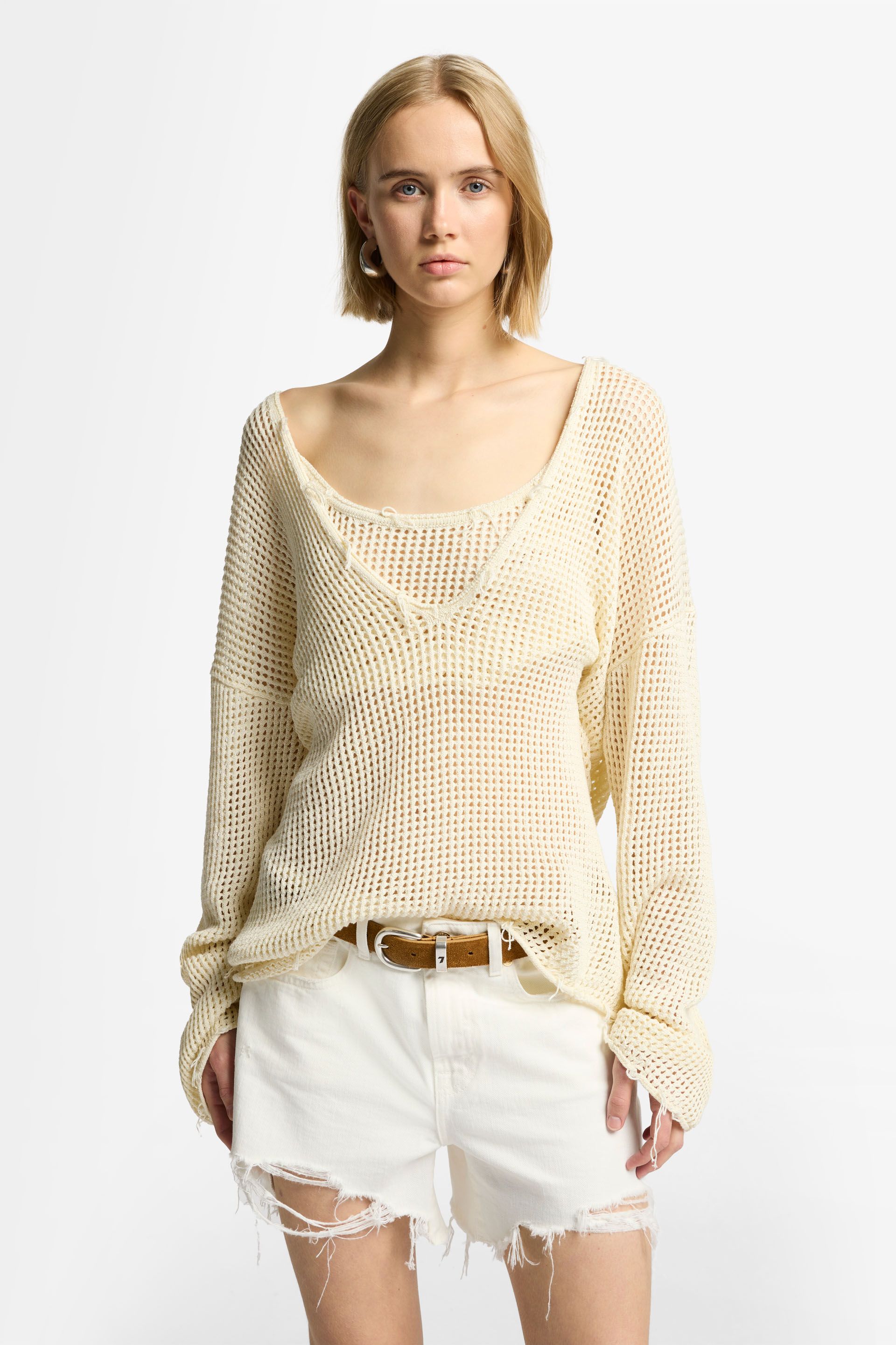 Esta temporada, añade nuestro jersey con escote de pico pronunciado a tu colección de prendas de punto. Su diseño de corte amplio está confeccionado en una suave mezcla de algodón de color crudo que va con todo. Nos encanta lucirlo con nuestra camiseta de tirantes de corte cropped y vaqueros cortos de tiro alto.