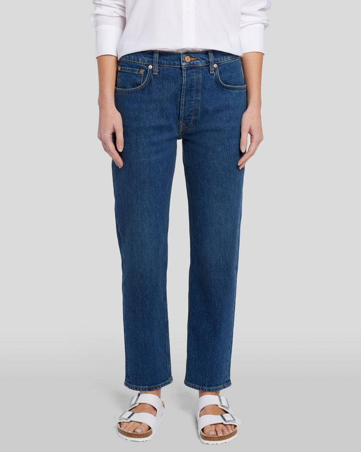 Este clásico lavado azul medio está rematado con una bragueta de botones.