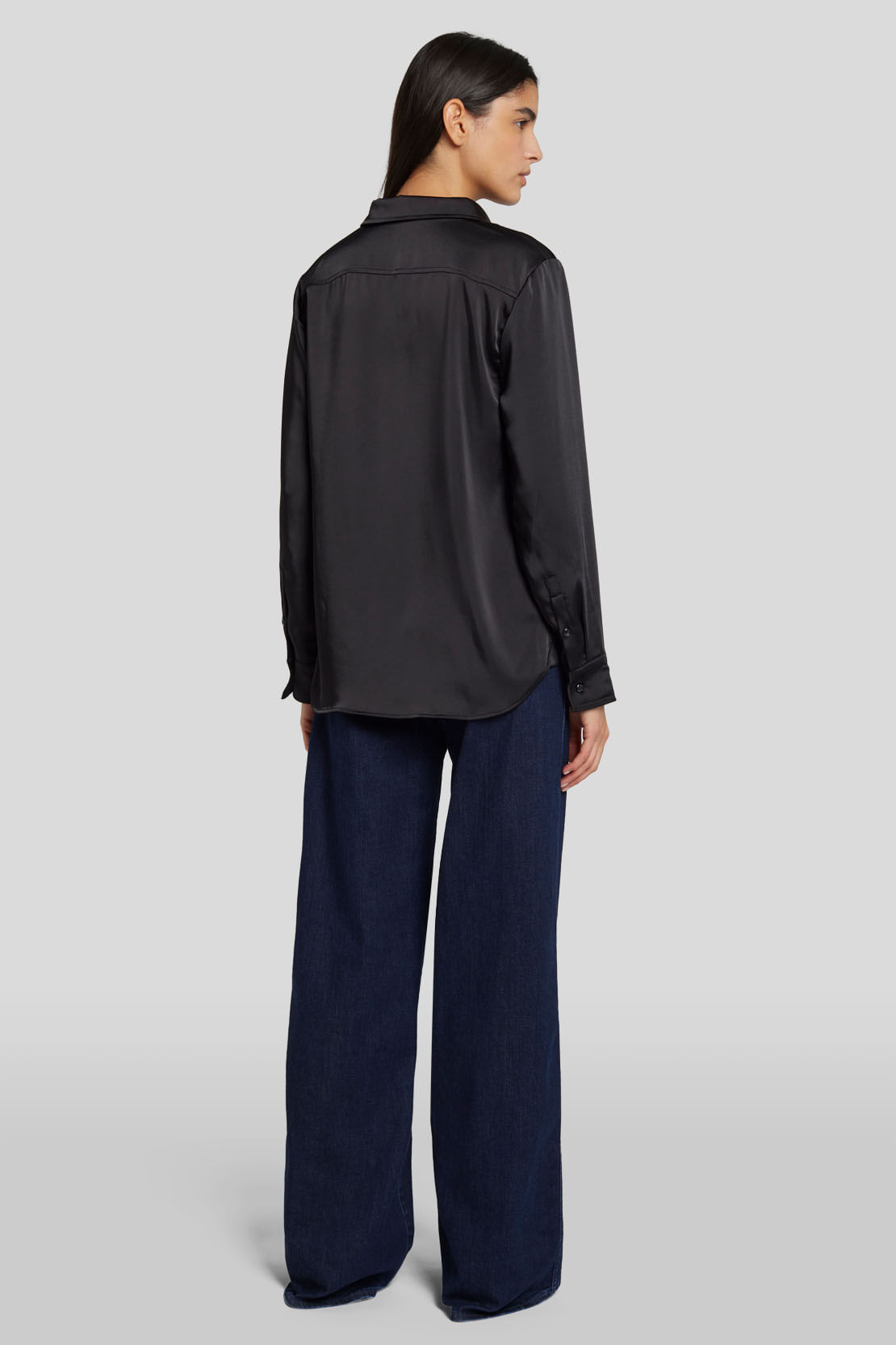 Una camisa de raso negro es la prenda más versátil que puedes tener en tu armario de noche, y nuestra versión de temporada es el modelo definitivo. Llévala a medio abotonar con unos vaqueros de tiro alto y pernera ancha, y completa el conjunto con unos botas.