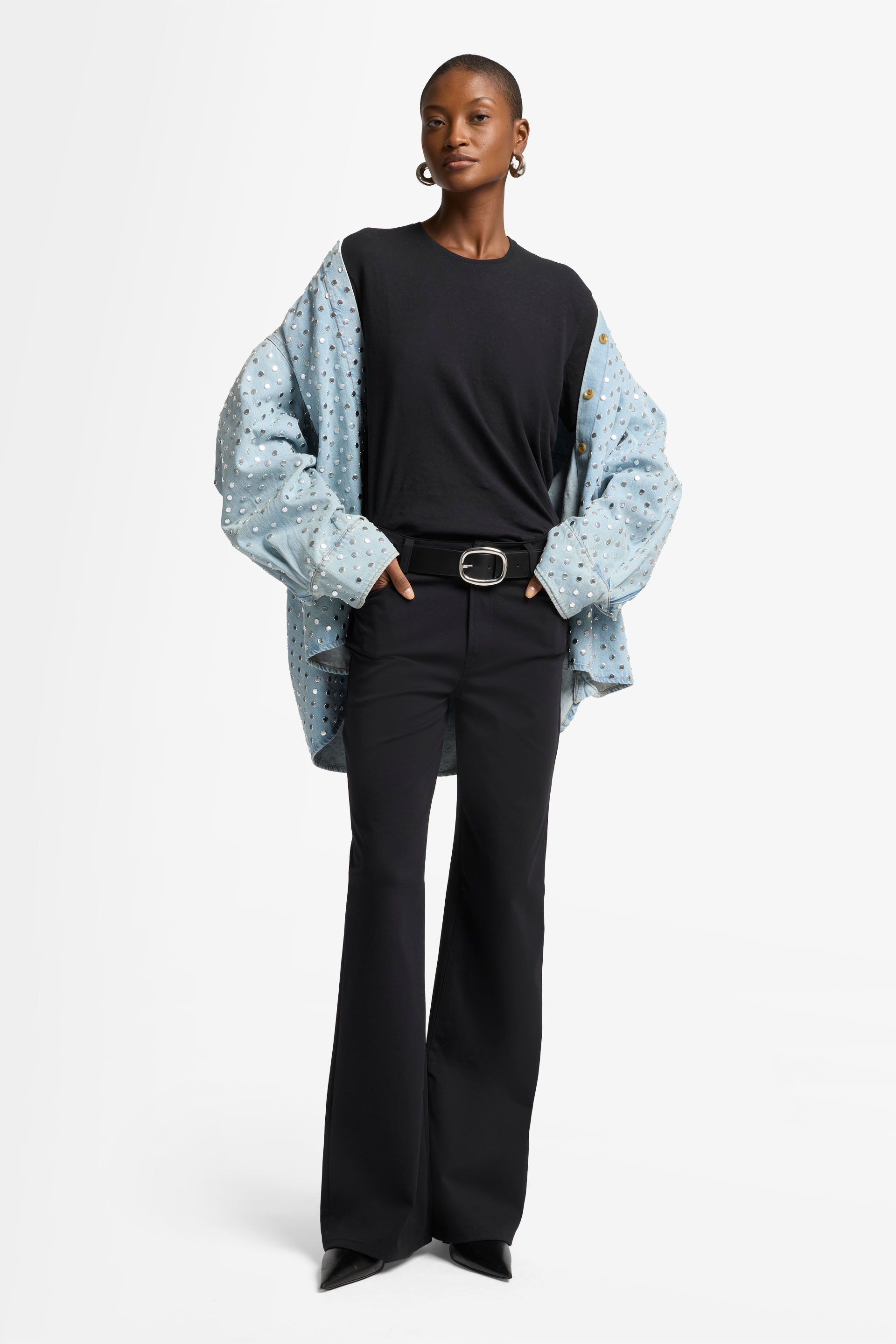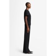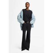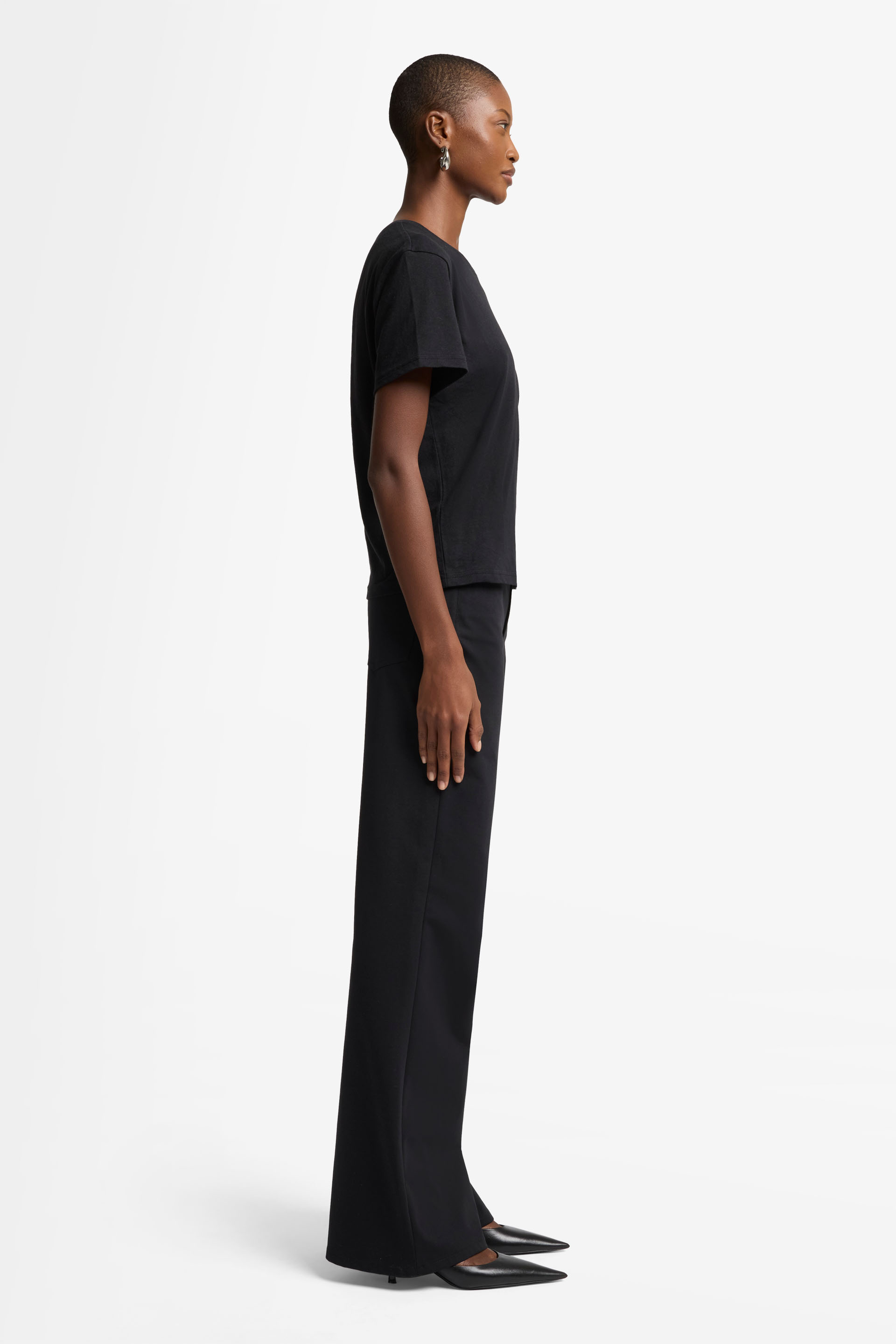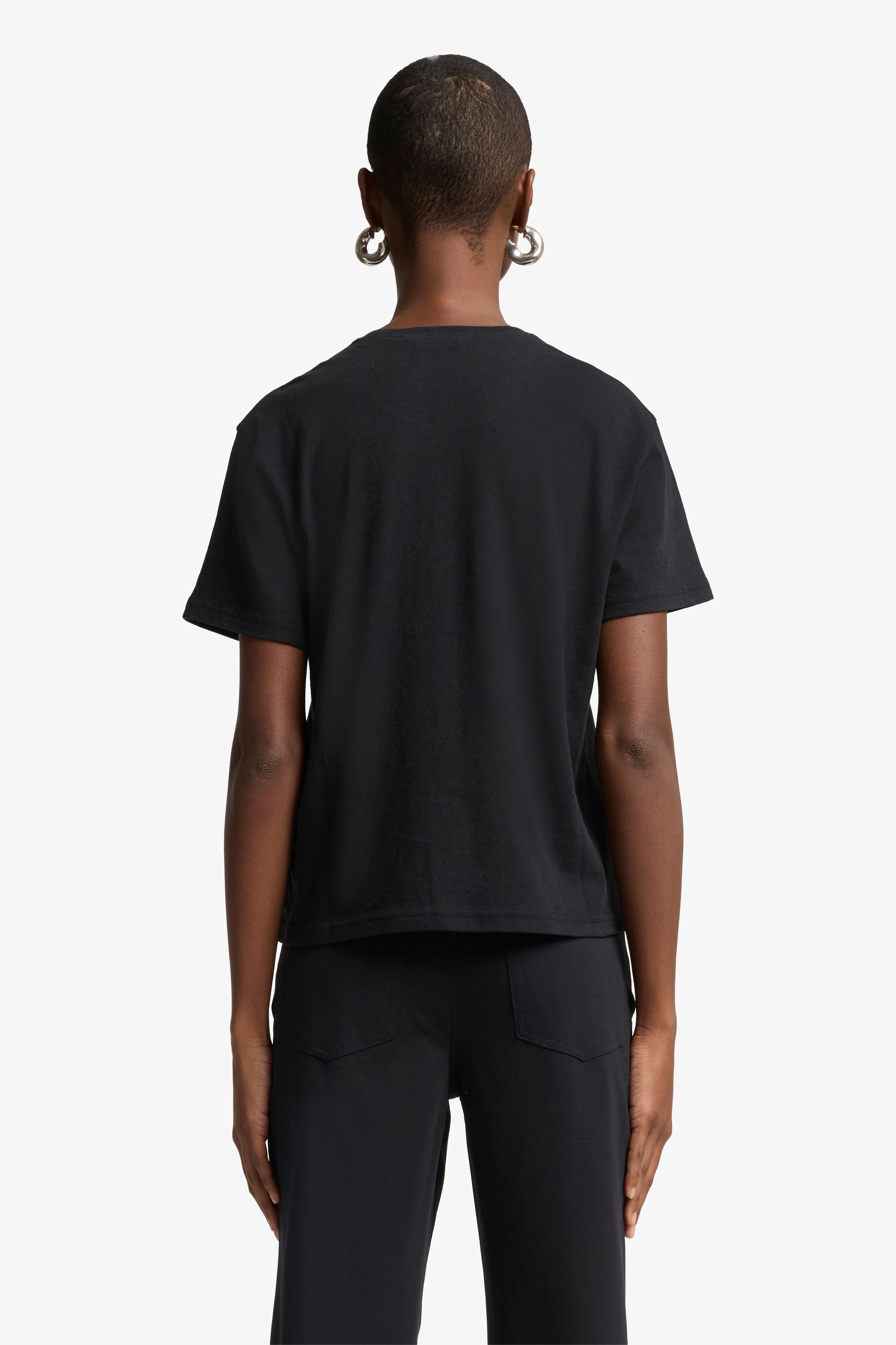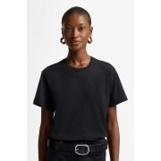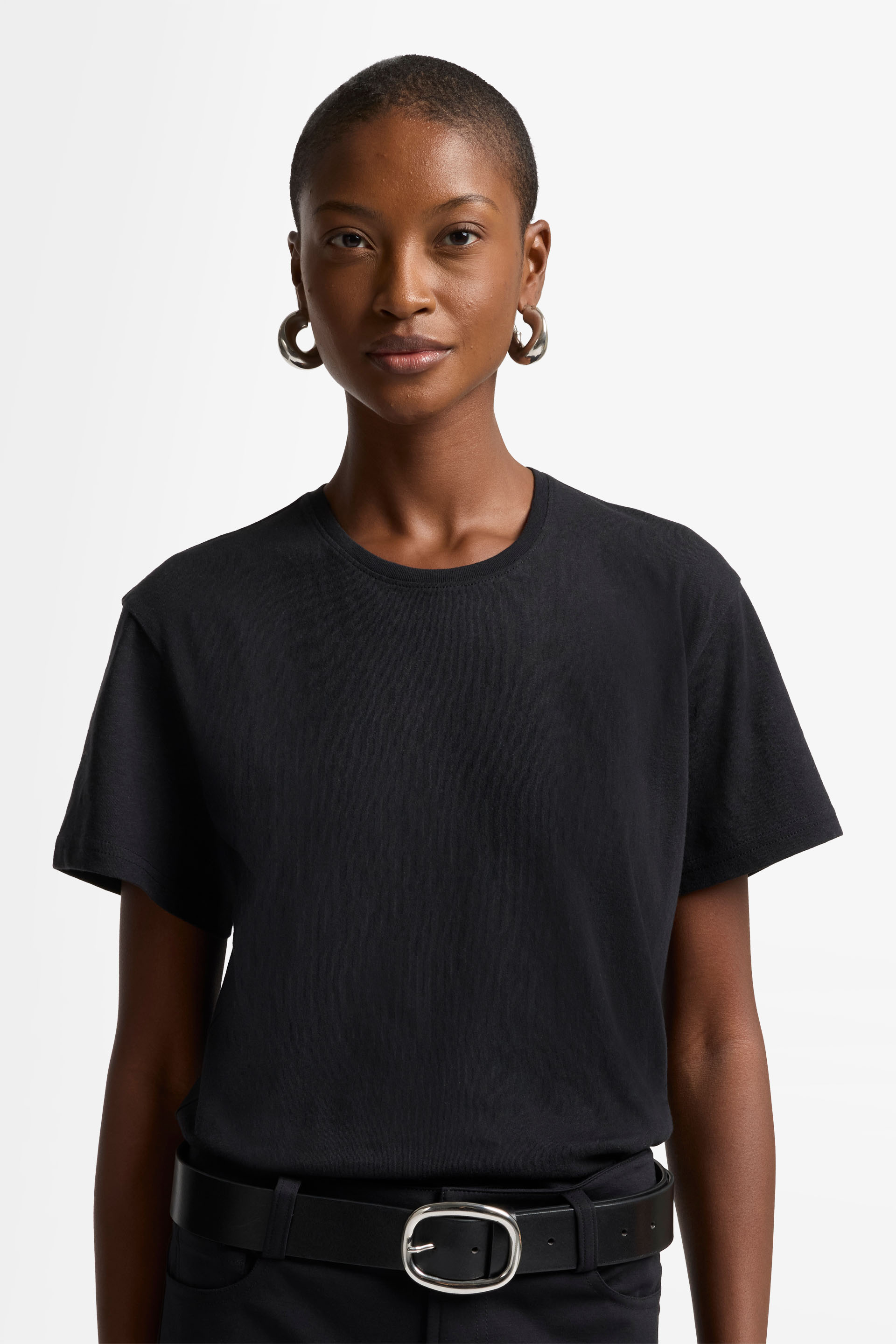 Esta camiseta, confeccionada en un tejido ligero de mezcla de algodón y lino, es perfecta para los meses más cálidos. Destaca por un diseño de manga corta con cuello redondo, clásico y corte amplio. Ponte esta versión negra con vaqueros acampanados y una sobrecamisa con efecto desteñido.