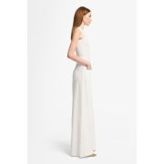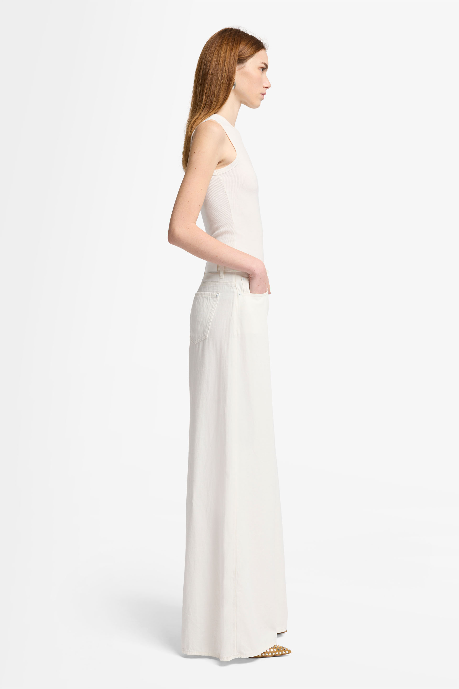 El pantalón Willow Wide en blanco roto, confeccionado en un vaporoso tejido de lino, es una prenda imprescindible para el verano. Presenta un diseño de cinco bolsillos con tiro alto y pernera extraancha. Crea un conjunto tonal al agregar una camiseta sin mangas blancas y zapatos destalonados de color miel.